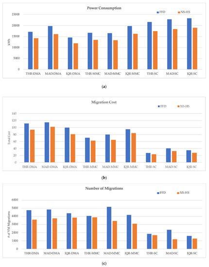Figure 9a–c shows the results of comparing power consumption, VM migration cost, and VM migration count, which are the performance measures related to the objective function, for each combination. By applying VM consolidation, the power consumption was reduced in all combinations, and the power savings of the NS-HS were better than those of the FFD. The SC policy combination proposed in this study showed less improvement in terms of power savings compared to other VM selection combinations. However, it showed improvement in terms of VM migration cost and number of VM migrations. The THR-SC combination with the best migration cost showed about 77.15% improvement compared to the worst MAD-DMA, and number of migrations, which is the best THR-SC combination, showed about 53.15% improvement over the worst THR-DMA combination. The results of the NS-HS versus FFD were better in terms of performance measures associated with the overall objective function, and the combination with the SC policy was less effective in terms of power usage than the other combinations, but improved in terms of VM migration, which is applied as the penalty in VM consolidation.