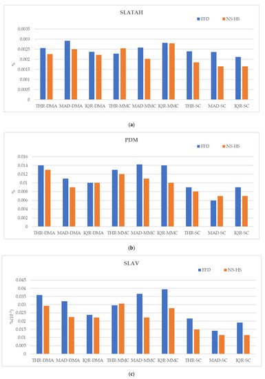 Figure 10a–c shows the results of the SLATAH, PDM, and SLAV values, which are the performance measures related to the quality of the DC operating environment. Similarly, in the performance measure, the NS-HS produced better results than the FFD. When comparing the SC policy combinations and other combinations based on the NS-HS, SLATAH showed about 26.22% improvement over the DMA combination and about 30.03% improvement over the MMC combination. PDM also showed about 31.25% improvement over the DMA combination and about 33.33% improvement over the MMC combination; SLAV, which is the product of SLATAH and PDM, showed an improvement of about 33.33–62.25%. Through these results, it is confirmed from the experimental results that the VM consolidation model considering the SC combination contributes toward stable DC operation.