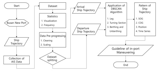 In order to solve these problems, it is necessary to analyze the predominant patterns of ship trajectory. The analysis was based on AIS data for ship arrival and departure in a port. Through the results of this study, a basic study on the MASS technology of ship maneuvering in ports can be proposed, and human error can be prevented. In addition, in the short term, it is possible to propose ship maneuvering guidelines for ports. Accordingly, a flowchart of this investigation is shown in Figure 1. In this study, AIS data on vessels arriving at and departing from the Busan New Port in the Korea were collected and analyzed by dividing them into port arrival and departure data. The algorithm that was then used to analyze the patterns of ship trajectories was the same DBSCAN algorithm as that used in previous navigational route studies.