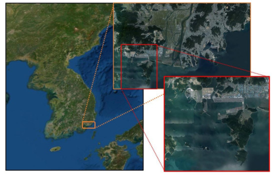 The target port to be analyzed in this study was the Busan New Port in the Korea. Busan New Port is the world’s sixth-largest port in terms of gross container volume handling, and the target port has large-scale container ship berths and sees the frequent entry and departure of large container ships [23]. In addition, as an accident involving a gantry crane collision recently occurred, it was determined that this location would be suitable in terms of developing a new port maneuvering guideline. The geographical location of Busan New Port is shown in Figure 2.