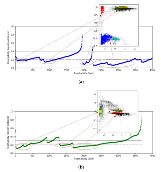 There is no general way to determine ε and minPts, which are important parameters for applying the DBSCAN algorithm [11]. However, ε can be calculated through the reachability distance derived by the Ordering Points To Identify the Clustering Structure (OPTICS) algorithm [35]. The parameter ε calculated at the reachability distance is almost identical to that of the DBSCAN algorithm [36]. In OPTICS, the core distance connecting the core point is defined as the following equation: