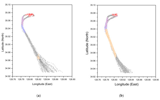 The ship trajectory based on AIS data includes ship latitude, longitude, SOG, and COG according to a time series. Therefore, the information contained in the AIS data was entered as a variable and applied to the DBSCAN algorithm. The application of the DBSCAN algorithm employs Scikit-learn [37] in Python. The result is shown in Figure 8.
