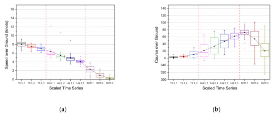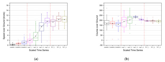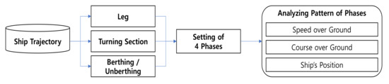 According to Figure 8a, by applying the algorithm based on the arriving ship’s trajectory, the turning section where the ship changed course was derived into three clusters and the berthing step was analyzed in the last step. At this time, the part listed between each cluster was designated as the leg. According to Figure 8b, in applying the departure data, the unberthing stage and turning section corresponding to purple and blue, respectively, were the same as the analysis result pertaining to arrival. However, the area corresponding to the leg of the arrival was analyzed as an orange cluster. Therefore, the arriving ship’s trajectory was classified into seven stages and divided into three turning sections, three legs, and one berthing stage. Additionally, in the case of departure, it was classified into six stages, divided into the one unberthing stage, two turning sections, and three legs. The classified stages were re-designated as four phases with the same properties, and the pattern was analyzed [38]. Figure 9 shows the framework for the pattern analysis of a ship’s trajectory, with detailed items having been analyzed for the SOG, COG, and the ship’s position.