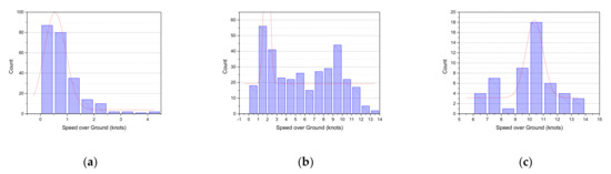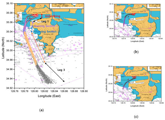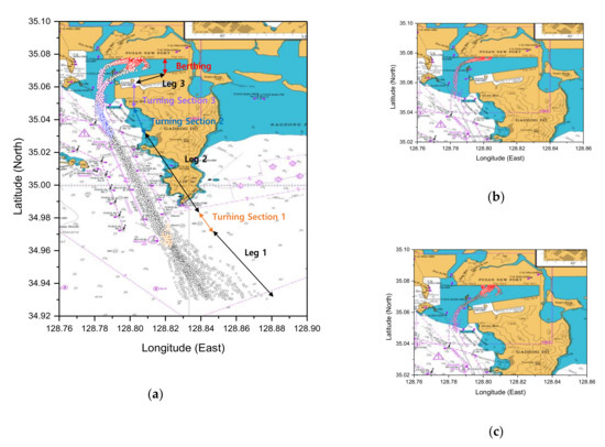 The result of plotting the arriving ship’s trajectory data on the British Admiralty Chart is shown in Figure 11a–c, which show the case of berthing by passing Todo to the left and to the right. Therefore, the pattern of the berthing phase was analyzed by dividing it into the left and right sides of Todo.