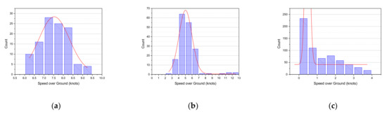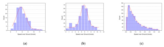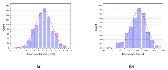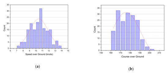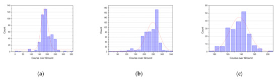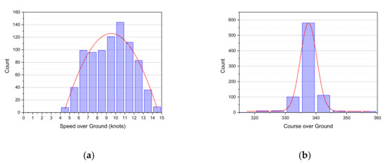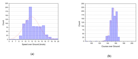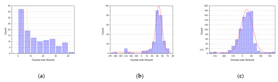 The breakwater phase corresponds to Turning Section 2 and is the process in which the waterway is exited and the breakwater passed through, as shown in Figure 11a. At this time, the average SOG is 9.44 knots and the distribution of the frequency count is as shown in Figure 16a. In general, it was analyzed with a high ratio of distribution of between 9 and 10.5 knots. The COG is shown in Figure 16b, and the ship that initially moved at about 336 to 338 degrees (32 counts) changed course from 358 to 000 degrees (57 counts).