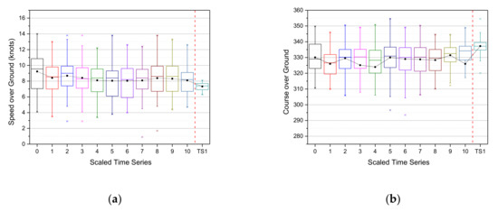 The time series analysis of this phase was performed by adding the boxplot of the turning section (TS1) to that of Leg 1, divided into 11 stages, from 0 to 10, with the results shown in Figure 13. According to Figure 13a, ships moving at an average of 9.23 knots at the starting point gradually decrease their SOG and finally decrease to an average of 7.32 knots at the turning section. The change in the time series of the COG is shown in Figure 13b, and the COG, which changed in various courses, is ultimately determined as having an average of 337.25, similar to the direction of the waterway in the turning section. The summarized descriptive statistics are shown in Table 5, below.