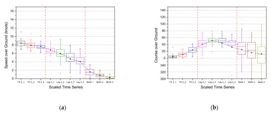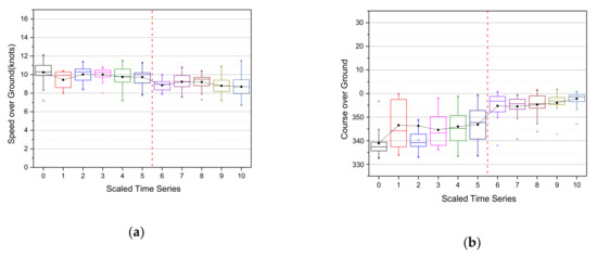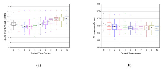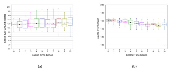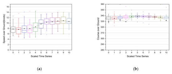 Boxplot time series analysis of the arrival breakwater phase: (a) SOG; (b) COG; * the time series analysis for ship trajectories in this phase is expressed in 11 stages, from 0 to 10, by multiplying the result scaled in Equation (1) by 10. In addition, the boxplot was used to visually express the descriptive statistics for 11 stages.