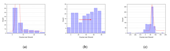 The departure phase is the process by which the ship passes through the waterway and fully exits the port, as is shown in Figure 25a. The SOG of this phase is 203 counts, with the most at 11–12 knots, as is shown in Figure 36a, and the average SOG of the ship being 12.31 knots, which is considered a fast speed in this setting. The distribution of the COG is shown in Figure 36b, and the various courses are set according to the position of the next port of each ship.