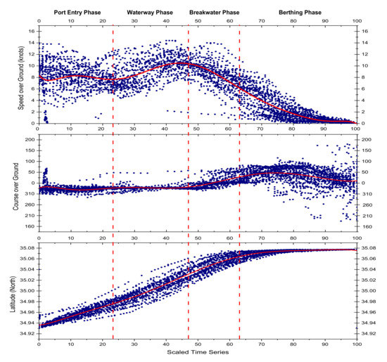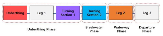 In order to analyze the pattern of the ship’s arrival trajectory, the phases were classified as shown in Figure 10. The stage from the point when the ship is boarded by the pilot and before entering Gadeog Sudo was designated as the “port entry phase”; the stage through the Gadeog Sudo was designated as the “waterway phase”; the stage in which the ship passes through the breakwater for berthing was designated as the “breakwater phase”; and the stage of passing through Todo island and berthing to the pier was designated as the “berthing phase”. The time series analysis for ship maneuvering in each of these phases is expressed in 11 stages, from 0 to 10, by multiplying the result scaled in Equation (1) by 10.