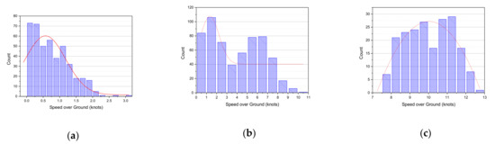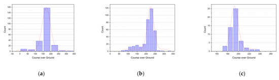 The waterway phase is the process, shown in Figure 25a, of passing through the Gadeog Sudo. This phase is characterized by the pilot disembarking in the middle section of the waterway. Therefore, as is shown in Figure 34a, the frequency of 8–9 knots and range of 11–12 knots comprise the highest proportion. Additionally, in the case of COG, it is similar to the direction of the waterway and, as is shown in Figure 34b, the counts of 162 to 164 degrees were the most frequent at 297, and the average was 169.92 degrees.