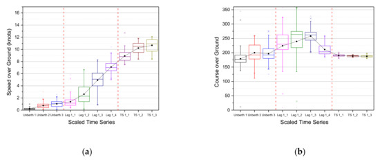 The time series boxplot of the departure phase has no significant change compared to the other phases. Figure 37 shows the time series of the SOG and COG, with the SOG usually being about 12 knots, which increases slightly. The ship’s COG is maintained in the same direction as the waterway and then changes in accordance with the destination of each ship. The summarized descriptive statistics are shown in Table 14.