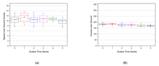 Boxplot time series analysis of the departure breakwater phase: (a) SOG; (b) COG; * the time series analysis Figure 6. stages, from 0 to 5, by multiplying the result scaled in Equation (1) by 10. In addition, the boxplot was used to visually express the descriptive statistics for 6 stages.
