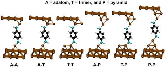 We employed the well-known SIESTA and TranSIESTA codes [13,54,55,56]. We constructed the junction geometries from the knowledge that the amine groups bind selectively to undercoordinated Au sites on the metal (111) surface [5,25]. We modeled the N-Au contact using three possible motifs consisting of one, three or four Au atoms (corresponding to adatom, trimer or pyramidal tips, respectively) and considered all possible combinations of these motifs. The resulting six structures are shown in Figure 1: adatom–adatom, adatom–trimer, trimer–trimer, adatom–pyramid, trimer–pyramid and pyramid–pyramid. We relaxed the positions of the atoms in the molecule and Au tip atoms until the residual Hellman–Feynman forces fell below 0.02 eV/Å. We used an exchange correlation functional which accounts for van der Waals (vdW) interactions [57]. For structure optimization, the real-space grid was defined with an equivalent energy cut-off of 250 Ry, while the reciprocal space was sampled using a 2 × 2 × 1 Monkhorst-pack mesh. For calculations of density of states, we used a 5 × 5 × 1 Monkhorst-pack grid.