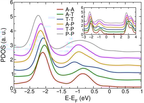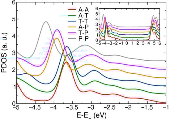 We began our analysis by studying the electronic properties of the junctions within DFT, as well as their variation with respect to the binding motifs (Figure 1). We focused only on the position of the HOMO peak, as it has been shown in the literature that HOMO dominates the zero-bias conductance for BDA [25,26,51,52]. Figure 2 shows the density of states projected over the atoms of the molecule for all the binding motifs considered: adatom–adatom, adatom–trimer, trimer–trimer, adatom–pyramid, trimer–pyramid and pyramid–pyramid. The figure is centered around the energy of the DFT HOMO peak (−1.0 eV). The inset shows the same data on an extended energy range. The data are offset vertically for clarity. From the figure, the position of the HOMO peak at the DFT level had a small variation across all different structures, ranging from −0.83 to −1.09 eV. The LUMO peak was found between 2.74 and 2.92 eV. From Figure 2, tip structures involving adatoms broadly resulted in sharper PDOS peaks and resonances closer to the Fermi level. In order to implement the DFT + Σ method, it is necessary to calculate the magnitude of the self-energy correction of the appropriate resonance (Equations (2) and (3)). We first address the calculation of the gas-phase self-energy correction of the HOMO peak, , which involves the calculation of the isolated molecule. Several ways of computing this correction are possible. One option is to optimize the geometry of the molecule. Another possibility is to compute the molecule in the geometry it adopts at the junction. In the case of BDA, the magnitude of both corrections was the same in all cases regardless of which approach was used, −2.99 eV, although we believe that this is due to the reduced conformational flexibility of the amine linker. We anticipated a spread of values for other linkers, such as methyl-sulfide groups, which rotate when adsorbed with respect to their gas-phase geometry. In this case, it would be more consistent to use the geometry the molecule adopts at the junction [20,35].