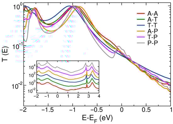 So far, we have focused on the DFT and corrected electronic properties, discussing how to calculate the magnitude of these corrections. In the final section of the paper, we turn to the electron transport properties and how to apply these corrections to DFT-based conductance calculations. Figure 4 shows the transmission spectra of the different BDA junctions calculated using the DFT-Landauer formalism. These calculations take the DFT-based electronic structure as input, with its well-known errors in resonance position. Figure 4 highlights the energy range below the Fermi level where the HOMO resonance, which defines zero-bias conductance, appears at the DFT level. As before, the inset plots the same data on a linear scale over an extended energy range. Figure 4 shows that low-bias conductance is determined by the tailing of the HOMO resonance into the Fermi level [25,26,51,52]. In Figure 4, the HOMO peak position is found between −0.85 and −1.00 eV over the tip structures considered, obviously following the DFT-based density of states (see Figure 2 and Table 3). This is to be compared to the HOMO transmission peak between −0.94 and −1.27 eV reported in the literature [25,26]. Calculated conductance values, given by the transmission at the Fermi level, are given in Table 4. Furthermore, as is common for DFT-based approaches, calculated conductance significantly exceeds the experimental value (6.4 × 10−3 G0) [25,51,52], in this case, by about a factor 10.