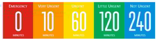 One major drawback associated with increasing demand in emergency departments is overcrowding, which leads to lengthy waiting times and, consequently, to potential security issues due to those waiting times. In an attempt to minimize this impact, triage procedures are essential, as they diagnose the patient’s clinical state severity leading to the establishment of organized flows. The hospital under study follows the Manchester triage protocol in which the patient receives a color in accordance with the severity state exhibited. Although the color received represents a severity in the patient’s clinical condition, it also represents the target waiting time until the first medical intervention, which can be seen in Figure 1.