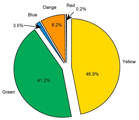 The hospital monitors the emergency episode for every patient by registering the times when changes occur in the episode state. For investigating the patient arrival distribution, it is only necessary to know the time when each patient was admitted to the emergency department, which is the first record in the hospital database. Therefore, the authors had access to the 2018 database which contained 92,978 entries referencing 0.2% red priorities, 8.2% orange priorities, 46.9% yellow priorities, 41.2% green priorities and 3.5% blue priorities, as can be seen by the pie chart presented in Figure 5.