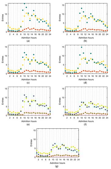Simulation models often use Poisson distribution to generate the entities (patients in the present case) since it is known to be the best distribution fitting to describe arrival events [28]. Such distribution only requires the input of one parameter, the arrival rate of the event, which in our case is the arrival of a patient. As mentioned previously, the average arrival was determined for every hour of the week, as shown in Figure 6. These values, as is easily perceived, represent the input parameter of the Poisson distribution, which is used by the simulation model to generate the arrival of a new patient. For the purpose of clarification, consider as an example the arrival pattern of the 10th hour of Monday, shown in Figure 6a, i.e., 16 green patients. This means that the simulation model will take 16 as the input parameter of the Poisson distribution for the tenth hour of Monday.