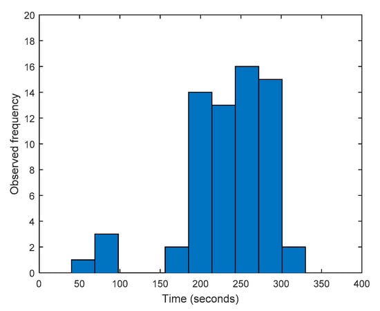 Different pathologies, as well as different priorities, will represent distinct treatment times. Since the database of the emergency department distinguishes the priority, as well as the diagnosis and the time from the first medical intervention until medical discharge, it was possible to treat such data using probabilistic fitting. As an example, for an episode characterized by a yellow priority with a diagnosis of “problem in the members” the treatment time for that type of episode is described by a lognormal distribution with mean of 113.836 s and a variance of 4667.12 s (Figure 10 represents the probabilistic fit). This procedure was carried out for the most common diagnosis presented in hospital database, representing around 90% of all types of episode (orange, yellow, and green) that the hospital must treat. Such detailed data analysis confers great reality upon the parameterized flow adopted for the study of the treatment rooms.