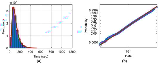 After entering the emergency department, which occurs when the registration process finishes, the patients have to wait for the triage process. Manchester’s protocol is applied, being assigned a priority level (represented by a color), as well as the medical specialist who will attend the patient. The triage duration is recorded for every patient and, thus, to analytically describe the triage process, a probabilistic fit of that data was performed based on the database provided. The maximum likelihood method [26] was used to determine the fitting parameter, being expressed in Figure 8 the data histogram and corresponding fit, as well as the probability plot. As can be seen by the Figure 8b, a Lognormal distribution (mean 4.58096 s and deviation 0.554615 s) shows a very good fit with the hospital database.