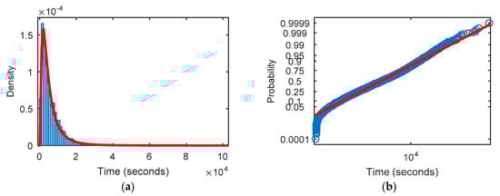Probabilistic fitting for the yellow patient with a member problem diagnosis for: (a) density function; (b) probability plot. (red line—theoretical distribution, blue—hospital database).