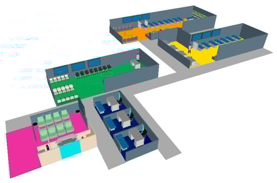To better understand and simulate the patient flow during an emergency episode it is important to consider the exact morphology of the emergency department. Figure 3 illustrates an overview of the emergency department plant, with different colors highlighting all relevant areas to the study. For consistency purposes, the color scheme used will be maintained throughout the rest of the article. The first stage on an emergency episode is the admission, which in this case occurs in the purple area. After being admitted, the patient will undergo the triage process (blue area), where a priority level is assigned, which determines the treatment area the patient will be placed. This case study will consider three priorities, green, yellow, and orange, and the corresponding treatment areas, as explained in the section triage procedures. Each of the rooms has a limited capacity in terms of treatment places, being 22 places in the green area, 15 places in the yellow area and 20 places for the orange area. Figure 3 illustrates the real emergency department layout after the structural redesign. The real plant (including areas, distances, and treatment places) was uploaded to the simulation model.