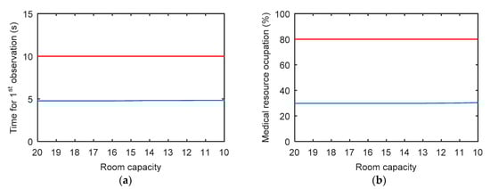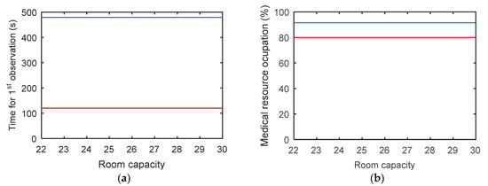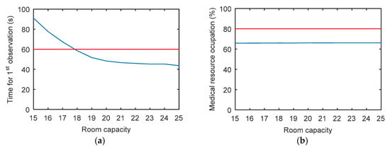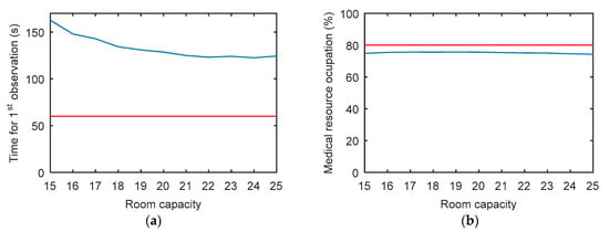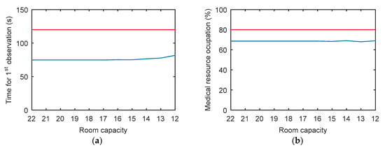 Obtained values for different capacity scenario: (a) waiting time for first medical intervention (blue line—simulation model, red line—Manchester time); (b) medical resource occupation (blue line—simulation model, red line—occupation rate limit).