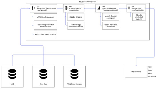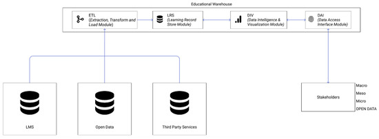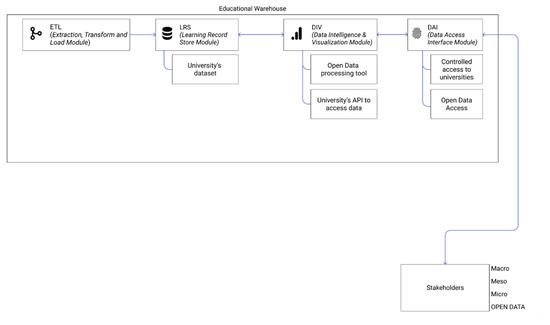 The educational warehouse architecture proposal for research entities working with open data: the modules represented offer the ability to progress towards the study’s objective.