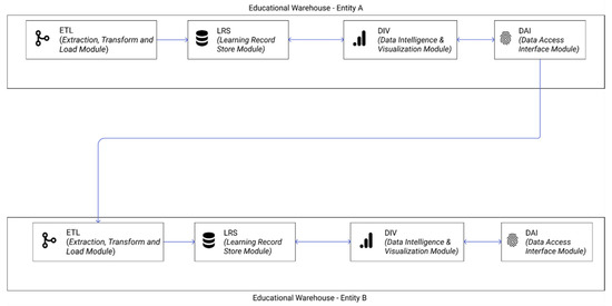 Interinstitutional use of an educational warehouse: data are exchanged between entity A and entity B, where entity A’s Data Access Interface (DAI) is the data origin of Entity B’s Extract, Transform and Load (ETL).
