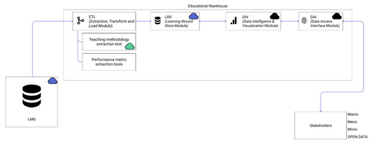 Our system architecture proposal fosters new research lines to identify new interoperability options between tools and institutions, to identify new storage formats to facilitate the analysis of data, to define machine learning models from specific educational data and LMS, to establish levels of data access in relation to legality or to define good data analysis practices preserving privacy and security of students’ data.