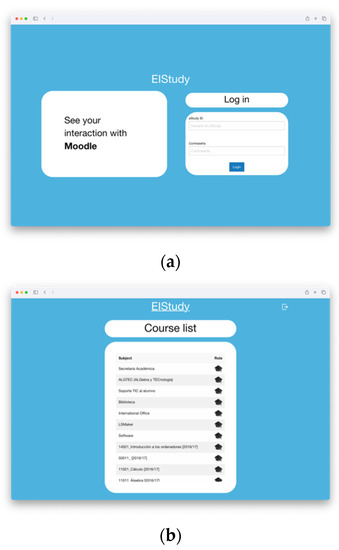 Figure 6. (a) EIStudy’s client login form: the user must log in using their credentials to get data related to his or her profile. If there is a failure to log in, no data will be sent to the user. If it works (b), it will enable the petition that sends details on the courses the user is enrolled in.