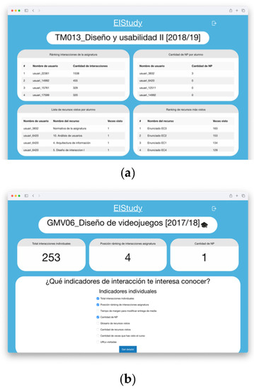 Figure 7. (a) EIStudy’s visualization toolL once the user creates a request to the educational warehouse modules, it offers data related to the specified content and its role. If the user is a teacher, he or she will be able to see “individual” values and “group” values, whereas students will only see “individual” values since they are not allowed to see data from other people in that context (b).