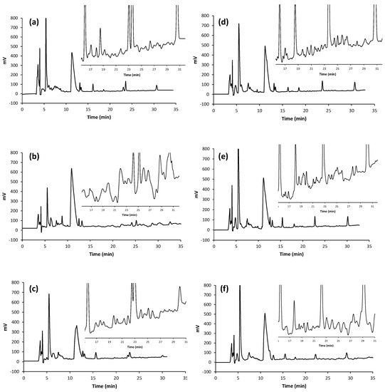 Chromatographic profiles obtained from SM substrate fermented with (a–c) L. acidophilus strain (strain LA 14) and (d–f) L. helveticus (LH field strain), at time points of 12 h, 72 h, and 400 h, respectively. The hydrolysates were extracted by TCA at 4 °C (see Section 2.4 for details). An enlarged portion of each chromatogram in the time-window 15–30 min is reported to evidence the richness of the chromatographic profile relatively to minor intensity detected peaks. The interference peak detected at 12 min corresponds to the TCA additive.