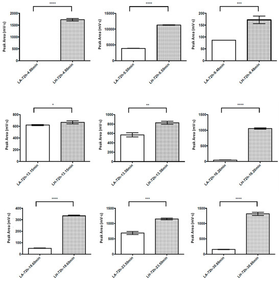 Graphical representation of the comparison between L. acidophilus (LA 14) and L. helveticus (LH) activity upon 72 h fermentation, based on area values of reference peaks (measured in mV·s). Data are the mean ± standard deviation (SD) of three replicates. Data were analyzed by a Student’s unpaired t-test. **** p < 0.0001, *** p < 0.001, ** p < 0.01, * p < 0.05.