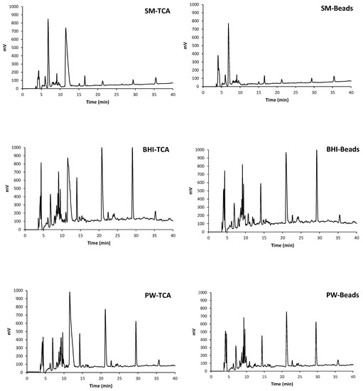 The elution profiles shown in Figure 3 highlighted substantial differences in terms of proteolytic activity by changing the substrate. On the contrary, a negligible impact was recorded by comparing the profiles relative to the two extractive protocols (TCA vs. beads) for each substrate. It can be observed that hydrolysates from BHI and PW showed similar and richer chromatographic profiles with respect to hydrolysate from SM.