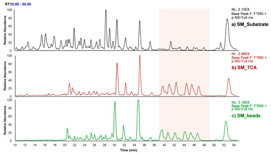 FTMS (Fourier Transform Mass Spectrometry)-Nanospray Ionization (NSI) spectrum: TIC (total ion current) zoomed into the separative gradient interval 10–55 min of SM-substrate, SM-TCA, and SM-beads samples acquired in data-dependent acquisition (DDA) mode. Light red square highlights the interval characterized by the greater diversity in terms of newly formed species due to the sample treatment.