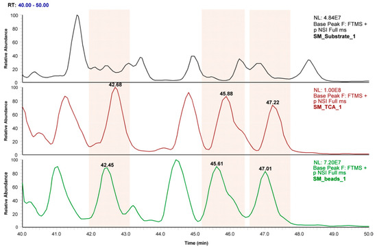 TIC (total ion current) zoomed-in the separative gradient interval 40–50 min of SM-Substrate, SM-TCA, and SM-Beads samples acquired in DDA mode. The light red squares highlight the peaks of interest.