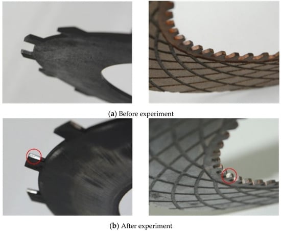 As shown in Figure 1, the spline teeth of the friction components have obvious wear marks after the experiments, indicating that the spline teeth were subjected to friction during the axial movement of friction components. However, relatively limited studies were devoted to the comprehensive analysis of the clutch structure and taking the spline friction into account. The paper [] offers a detailed mathematical analysis, given the spline friction, to investigate the various consequences on the FT of clutch. Newcomb et al. [] developed a contact pressure model of the friction pair to analyze the interface temperature distribution in view of the spline friction. Moreover, by using the thermal model of multidisc clutch, Yu et al. [] investigated the influence of spline friction on the temperature difference between different friction pairs.