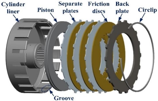 Figure 2 presents a three-dimensional exploded layout of the wet clutch visually. The separate plates and friction discs are arranged alternately, and respectively mounted to the cylinder liner and driving shaft by splines []. The circlip installed in the groove of cylinder liner plays a role in limiting the axial position of friction components []. By pumping pressure oil into the piston chamber, the friction components start to rub against each other, and the axial gap between them gradually disappears [,]. Meanwhile, the separate plates, as the driven part, transfer the input power to the transmission system. Finally, the dynamic friction of spline teeth converts to static friction after the gap is eliminated [].