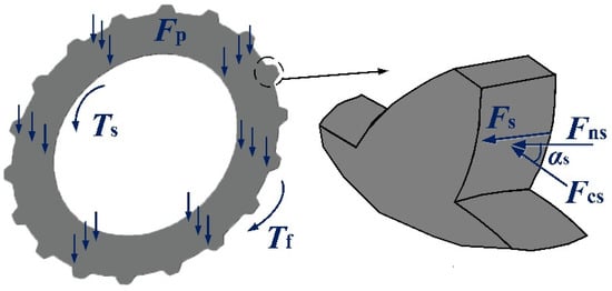 Since the structural characteristics of the friction disc and separate plate are similar, the separate plate is chosen for the theoretical analysis and formula derivation. As shown in Figure 3, during the constant speed sliding process of the clutch, the separate plate reaches equilibrium status under the combined action of FT Tf and cylinder liner resistance torque Ts. The friction force, nominal tangential force and normal force acting on the spline teeth are expressed as Fs, Fcs and Fns, respectively. Moreover, Fp is the axial contact pressure applied on the separate plate. Hence, the equilibrium equation can be written as