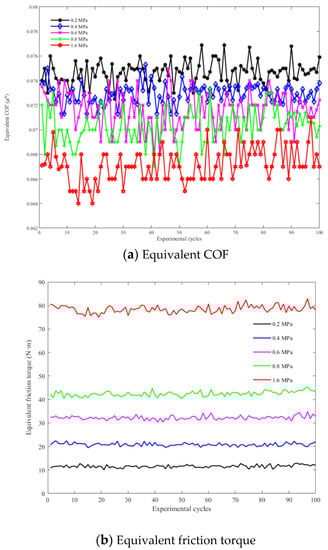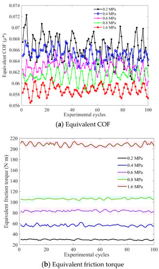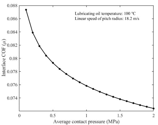 According to Equation (5), the variation of interface COF under different applied pressure is shown in Figure 5. The interface COF gradually decreases as the applied pressure varies from 0.2 MPa to 2 MPa. This phenomenon can be interpreted as follows. The increasing applied pressure leads to the rise of the asperity contact area between friction pairs, which makes the friction pair become relatively smooth []. Therefore, the interface COF decreases gradually.