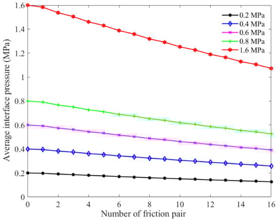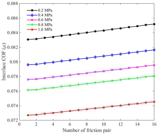 According to Equations (5), (7) and (8), the interface COF and contact pressure under different working conditions are shown in Figure 6 and Figure 7, respectively. As depicted in Figure 6, the farther the friction pair from the piston is, the greater the interface COF is. Moreover, as the applied pressure increases, the interface COF decreases gradually under the same number of friction pairs, which also has a good agreement with Figure 5.