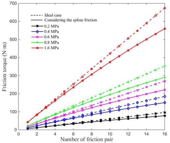 As shown in Figure 8, the FT increases linearly with the increasing number of friction pairs in the ideal case, and the more the friction pair is, the greater the FT is. Considering the spline friction, the growth rate of FT decreases gradually as the number of friction pairs increases. The reason is that the growth of interface COF is much smaller than the attenuation amplitude of contact pressure. Moreover, the greater the applied pressure is, the greater the loss of FT is. In other words, the spline friction will weaken the torque transmission capacity of multidisc clutch. For example, the reduction amplitude of total FT in a 16-friction-pair system are 18.5 N·m and 114.58 N·m under the applied pressure of 0.2 MPa and 1.6 MPa, respectively. Therefore, when the friction pair reaches a certain number, it is not reliable to realize a substantial enhancement of FT by continuing to add the friction components.