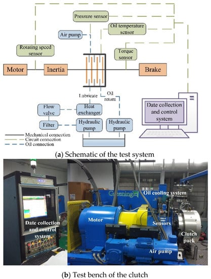 As depicted in Figure 9, the test bench is mainly composed of the motor, the clutch pack, the hydraulic system and the data collection and control system. The pressure exerted on the piston is applied by the air pump. The lubricating oil flows into the clutch to lubricate and cool the friction components, and the heat exchanger is used to maintain the oil temperature at 100 °C. In addition, the data collection and control system plays a role in monitoring the real-time signals, including the rotating speed, the FT, the applied pressure and temperature, etc. Moreover, it can also calculate the equivalent COF μ* of friction pair according to the total FT T* measured by the torque sensor, the equivalent COF can be given as