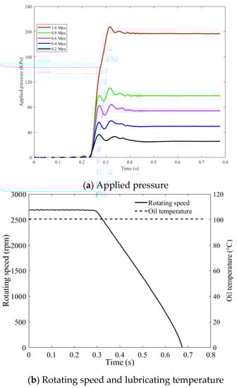 Before the formal experiment, a running-in test is essential to ensure the equipment works properly to collect the valid data. The arrangement of clutch pack is divided into two categories, namely, the two-friction pair system and six-friction pair system. During the experiment of the former system, the initial motor speed is 2686 rpm. Moreover, an experiment cycle consists of five engagement tests at the applied pressure conditions of 0.2 MPa, 0.4 MPa, 0.6 MPa, 0.8 MPa, and 1.6 MPa, respectively. In order to reduce the measurement error, a total of 100 experiment cycles are carried out successively. Subsequently, the same experiment scheme is also conducted in the six-friction pair system. Figure 10 shows the experiment conditions.