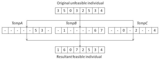 - Using the above mentioned vectors, a viable individual is constructed by adding to the empty items of TempA and TempC the places that do not appear in them and that are found in TempB.