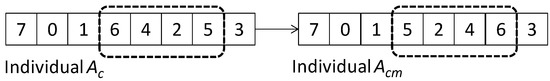 To increase the variability of the populations, a mutation operator is included, which is denoted by the symbol Θ (shown in the Equation (6)). Figure 4 shows the functionality of this operator. Given an Ac individual, initial and final positions are randomly selected; in the current example, these are positions 3 and 6. Once these positions are determined, the elements included in this sequence (items of positions 3, 4, 5, and 6) are inverted to create the mutated element Acm.