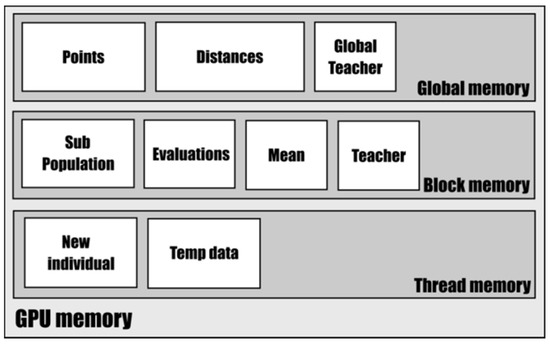 The first task that must be carried out to parallelize the algorithm is to conceive an adequate design of the memory structure and the execution flow to minimize the blockage of the different threads executing in parallel within the GPU. Thus, the different GPU memory levels are organized to manage different kinds of data (thread, subpopulation, and global levels) as shown in Figure 5.