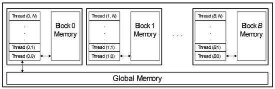 An execution flow was devised to minimize the blockages of the threads at the time of synchronization when running the algorithm (syncthreads). The TLBO consists of a series of phases linked in such a way that they make it necessary to synchronize the threads to obtain common data for the whole population, such as the mean individual and the best individual (Teacher). In addition, to obtain this information, the reduction technique is utilized to achieve a minimal number of iterations needed to obtain the aforementioned values from the population. To build a parallel execution of the algorithm, each thread corresponds to an individual of the population. The first thread (with index 0) of each subpopulation is responsible for carrying out the operations in the local memory, and the first thread of the first population is responsible for carrying out the necessary operations in the global memory. This is represented in Figure 6. In this manner, conflicts and delays in the access to the different memory levels are avoided.