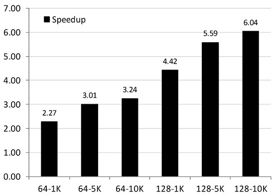 Experimentation was performed to compare the execution time when solving four TSP problems from the TSPLIB library [37]. A sequential implementation and a manycore GPU parallel implementation based on CUDA (9.2 version) were compared. The system used for performing the experiments was equipped with a Pentium i7 3.2 GHz and an NVIDIA GeForce 1060p graphics accelerator, 6 GB GPU RAM, and 32 GB DDR4 RAM. Different scopes were devised for each of the problems by varying the population sizes (64 and 128 individuals) and the number of iterations performed (1000, 5000, and 10,000 iterations). The cities from TSPLIB that were considered for the experiments were Berlin52, Att48, Eil76, and Ch130, with 52, 48, 76, and 130 urban nodes, respectively. They represent real scenarios taken from cities in Europe, USA, and China.